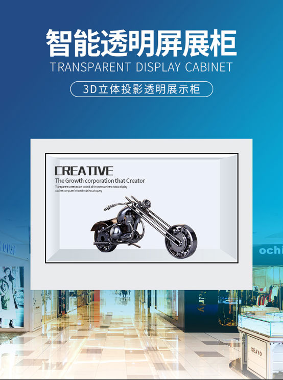 新一代液晶透明展示柜,在透明的的柜子上显示广告画面,播放视频,多角度的展示物品,柜子内可放置物品,透明显示器可以进行实物展示,信息的发布,简约时尚其独特的透明技术引领当今时代的广告新潮流。